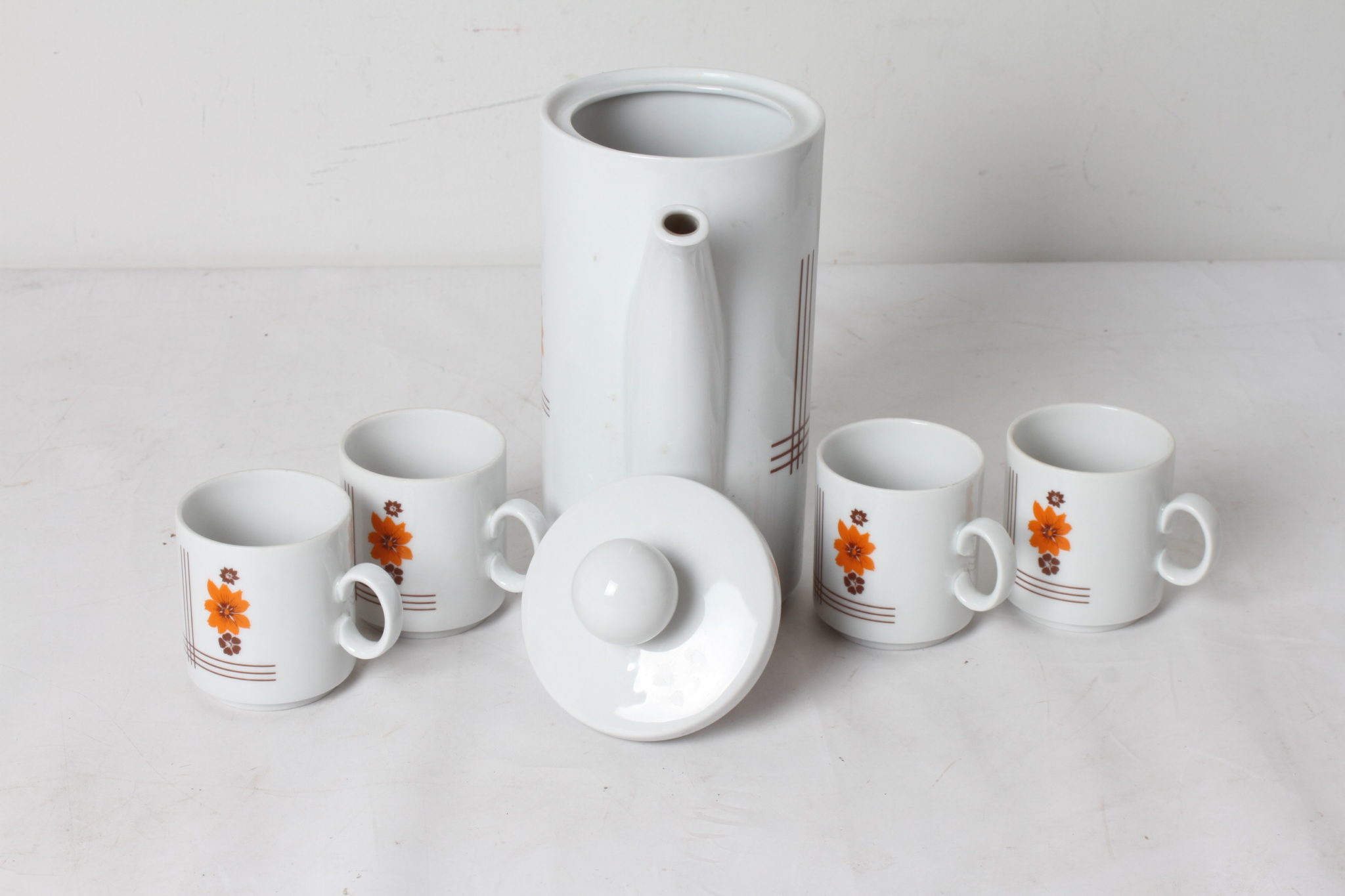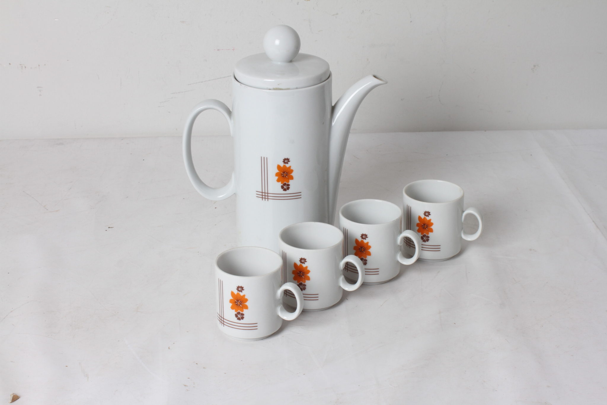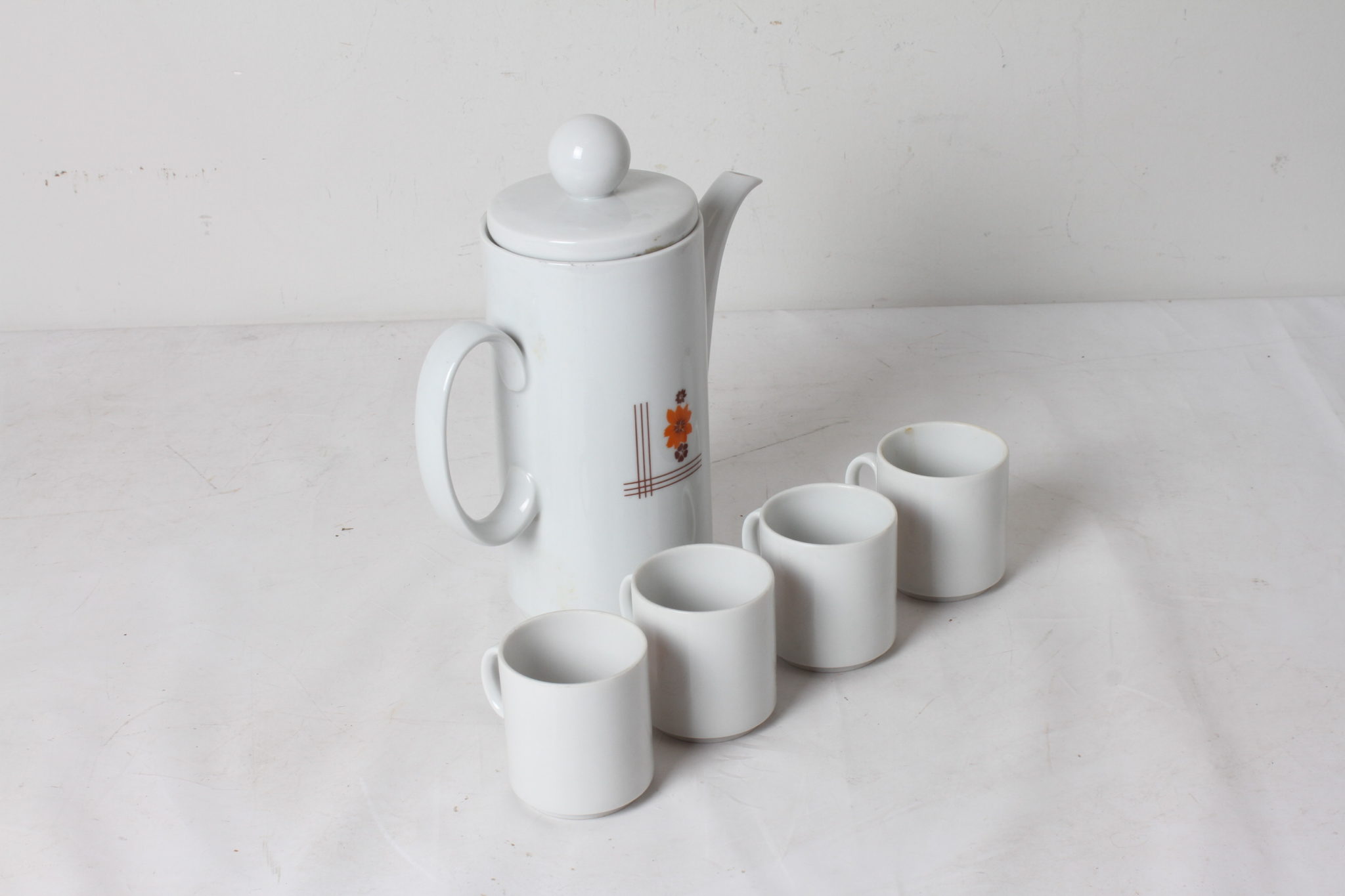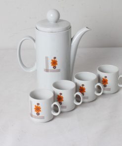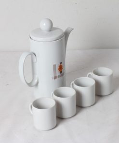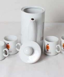 Cafetière en porcelaine et ses quatre tasses au décor floral vintage.