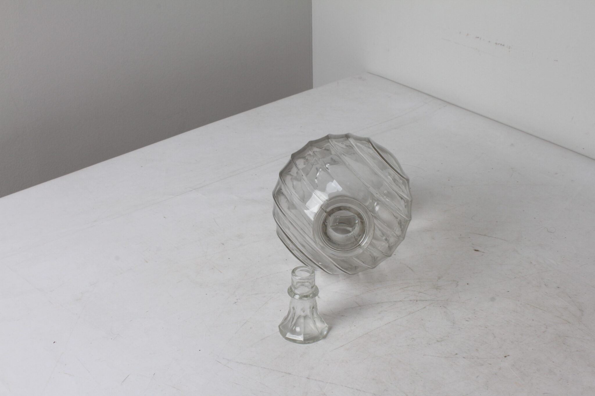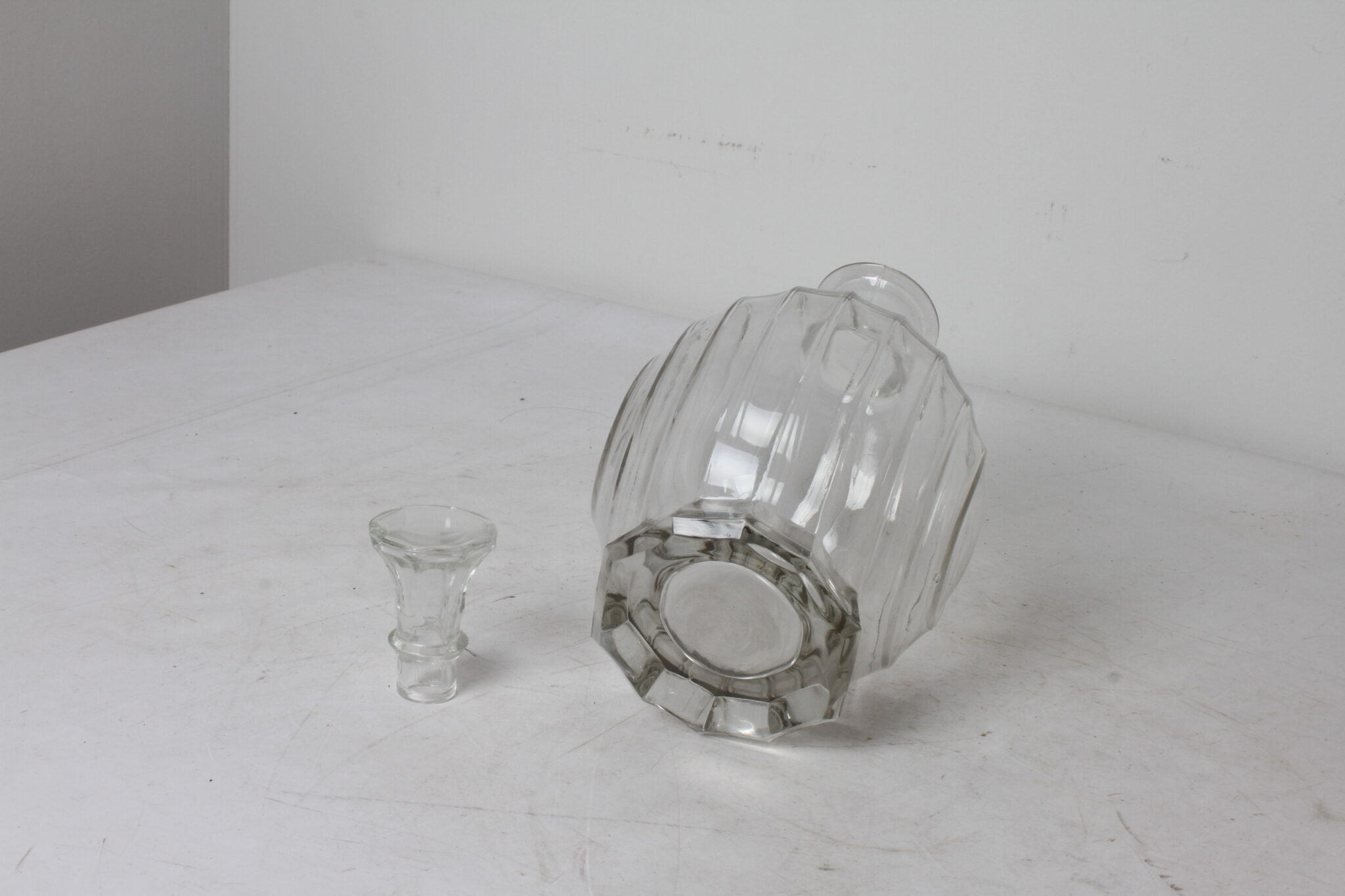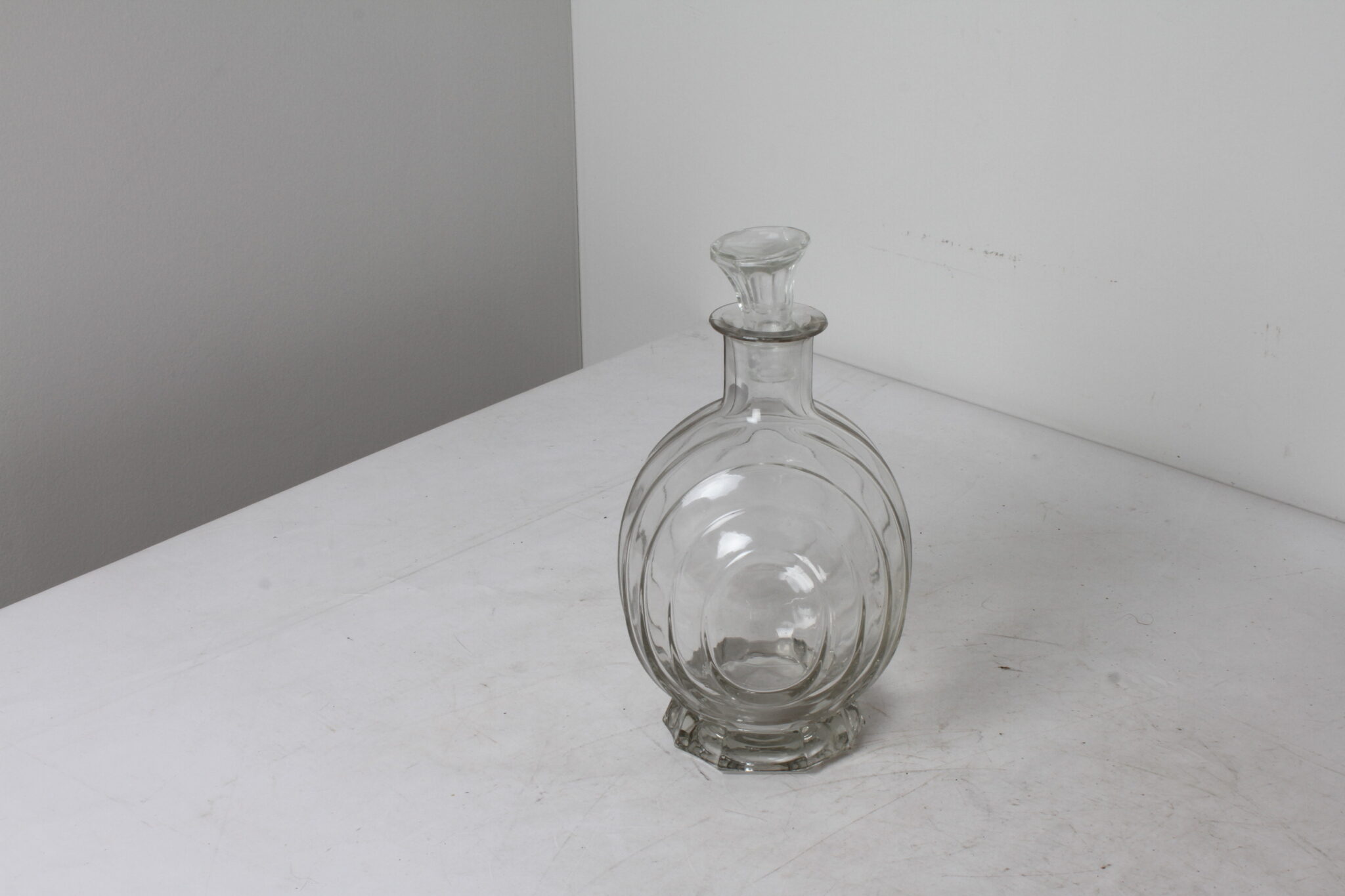 Belle carafe vintage en verre avec bouchon, style Art Déco.