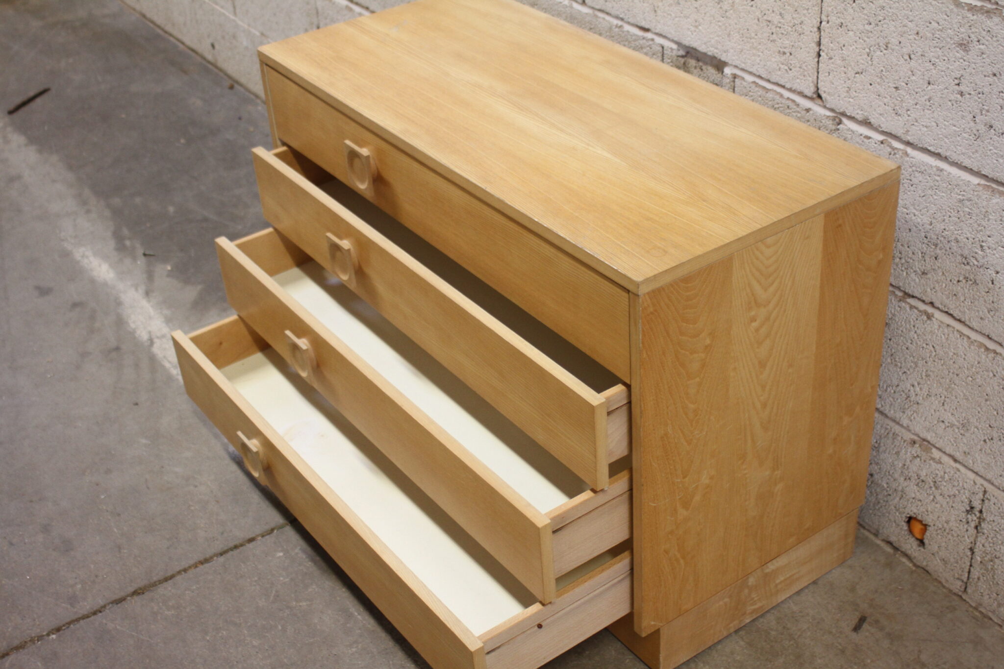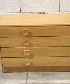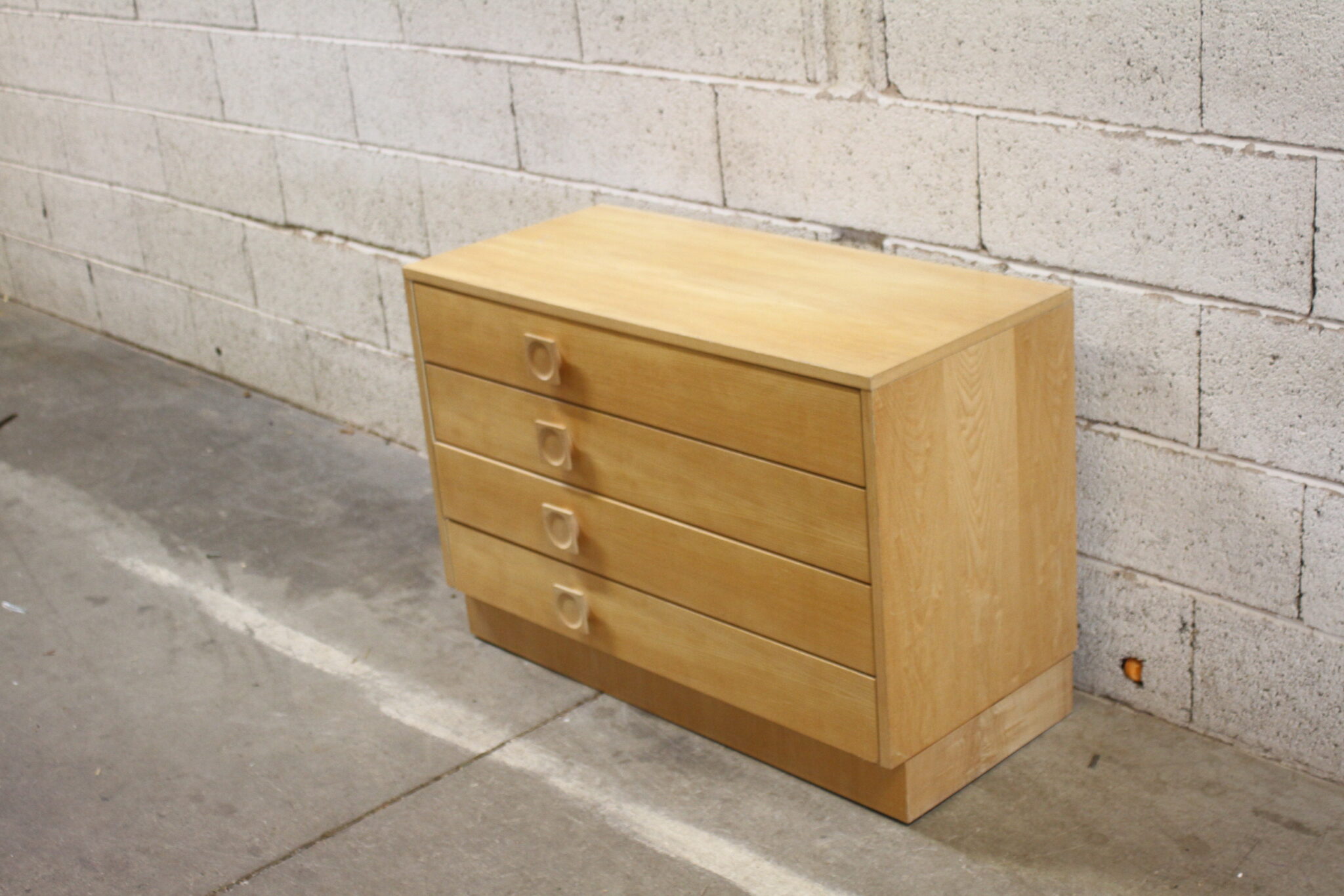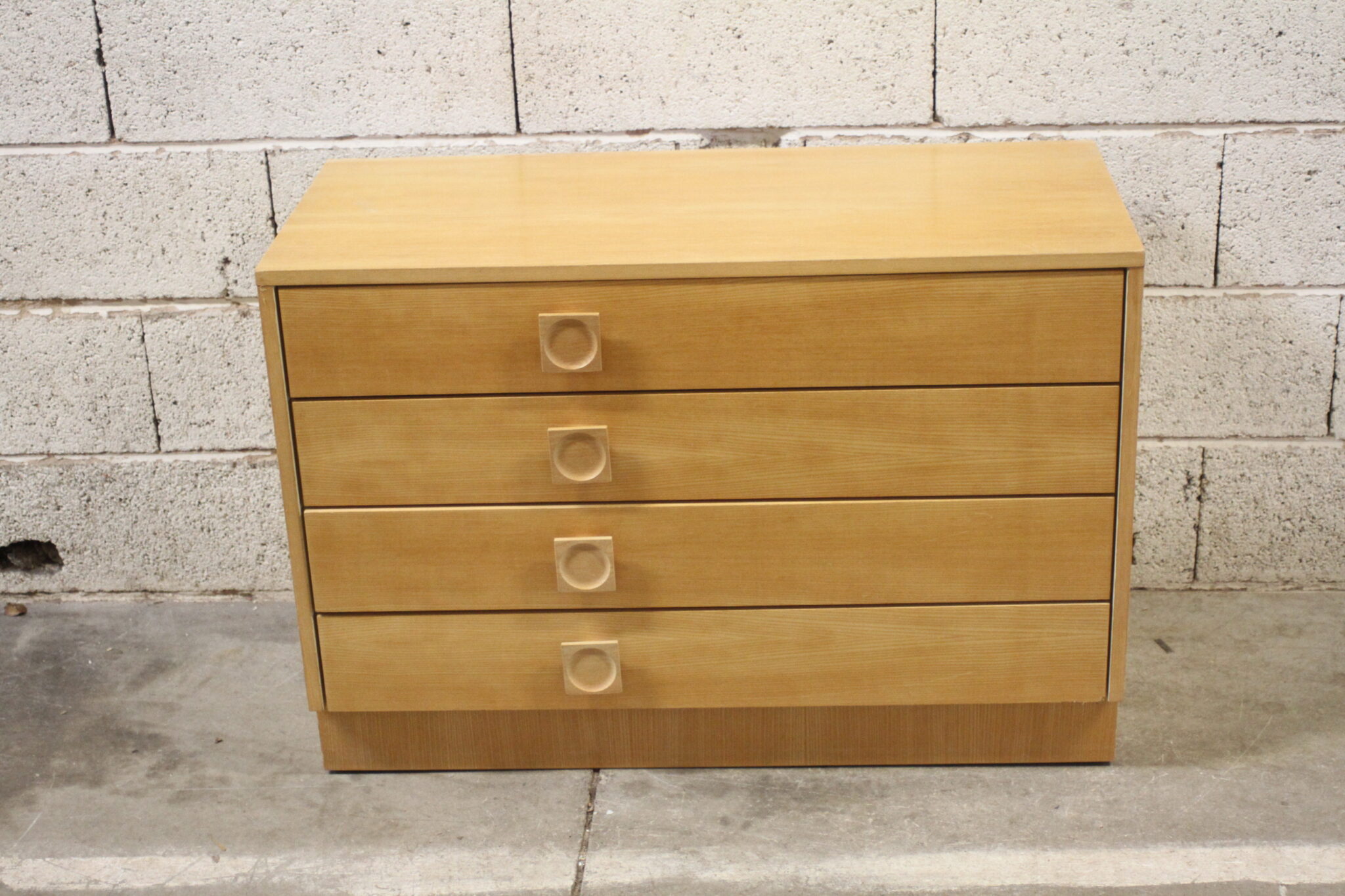 Commode en placage avec poignées de tiroirs carrées excentrées.