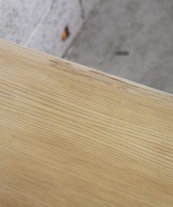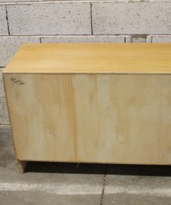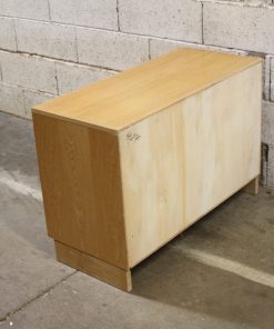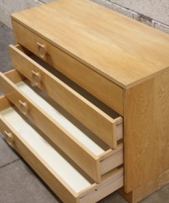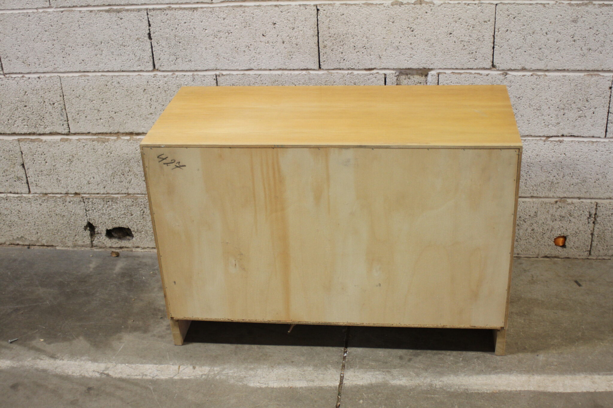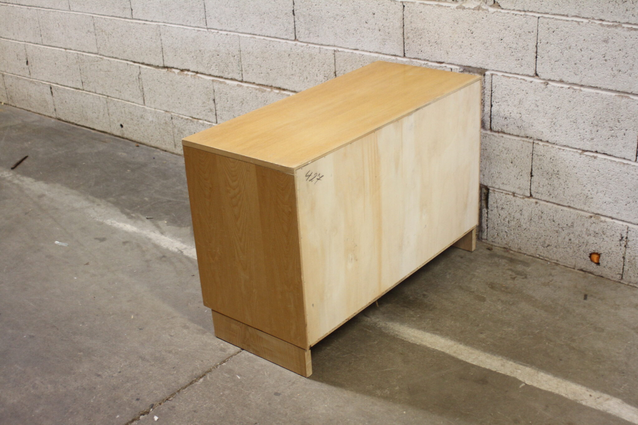 Commode en placage avec poignées de tiroirs carrées excentrées.