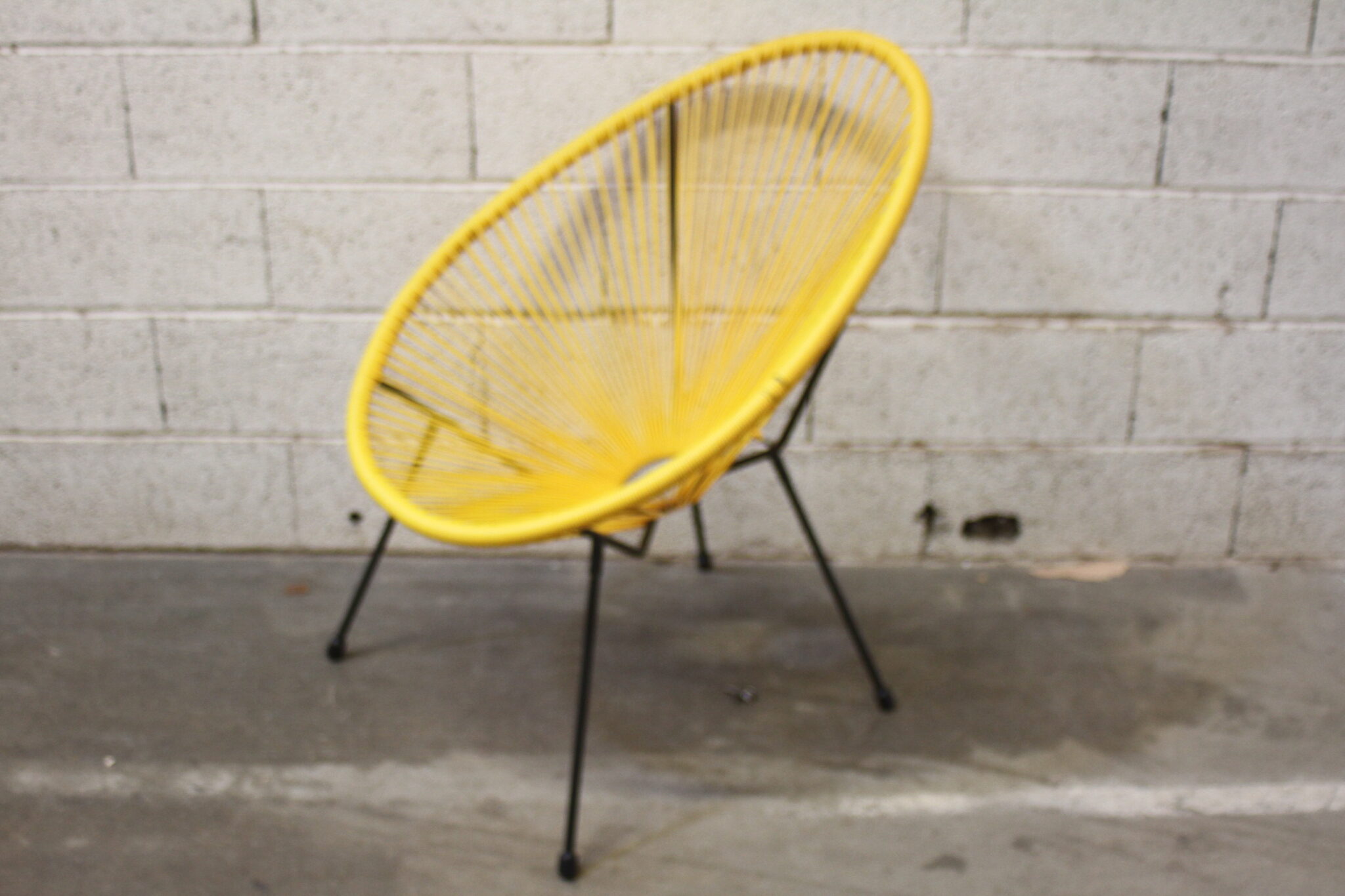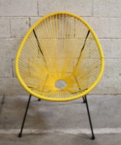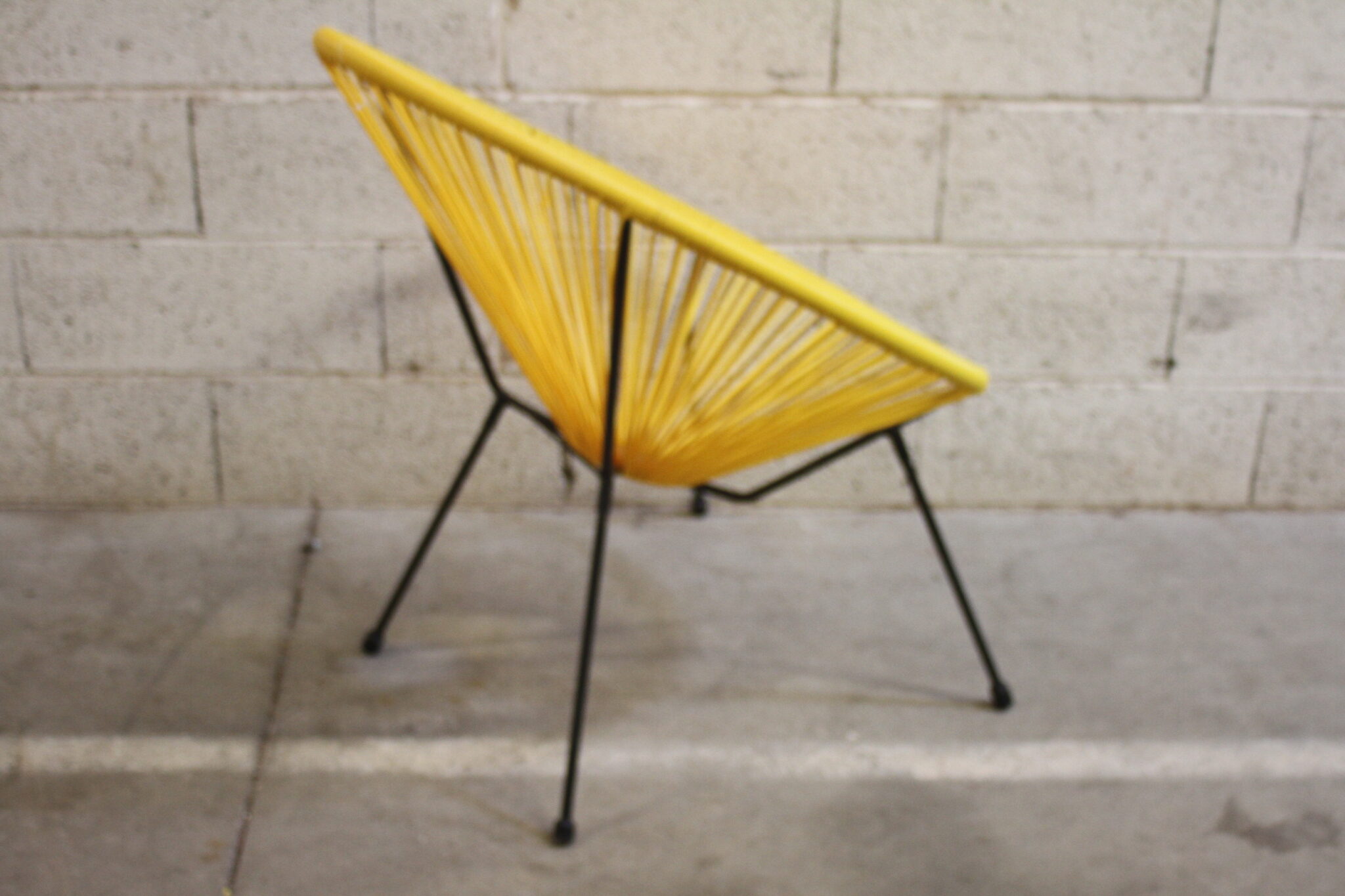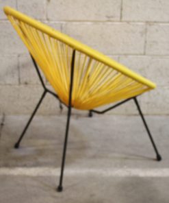 Joli fauteuil scoubidou de couleur jaune sur structure en métal noir.
